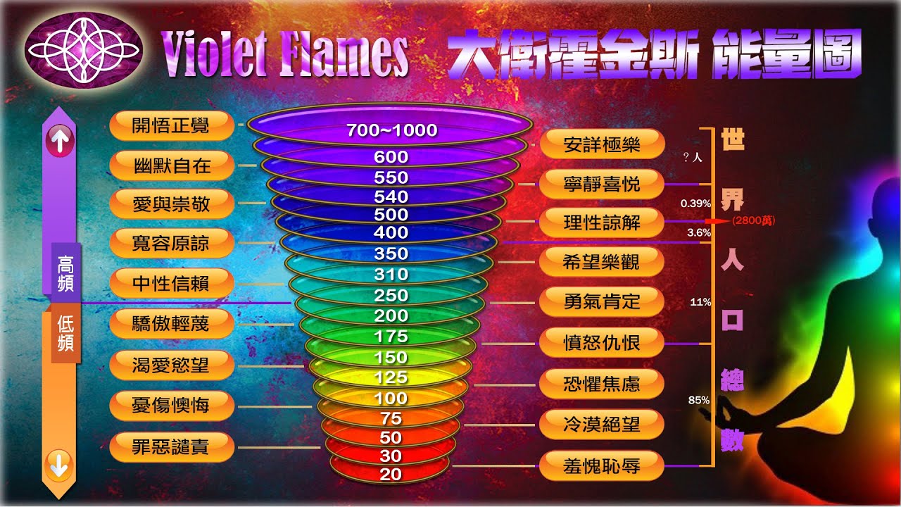 這集我們要來聊聊大衛霍金斯能量圖表。網路上有很多其他人製作的版本,但顏色往往不太正確,這張能量圖表是莫子做的,顏色是正確的:20 是紅色,最高是紫色,依序為紅、橙、黃、綠、藍、靛、紫,而白色是在所有脈輪之外。